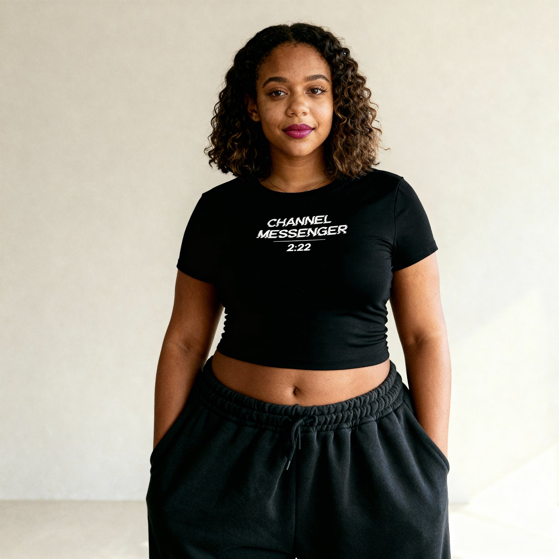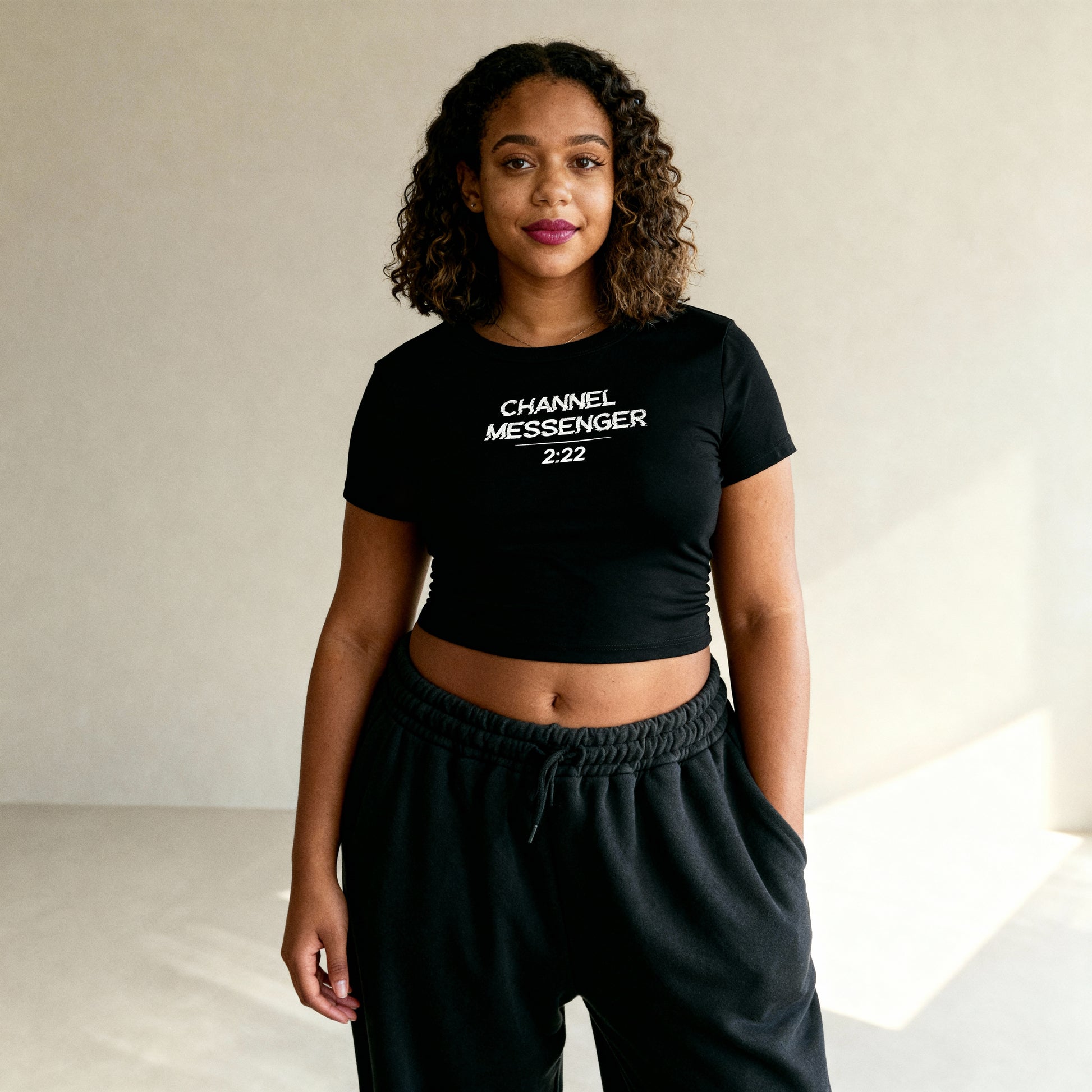 The glitch-text design of “Channel Messenger 222” represents your transmission between worlds — a digital distortion of awakening, a signal only the aligned can decode. Lightweight, form-fitting, and perfectly imperfect, this crop top embodies the moment your frequency shifts.
